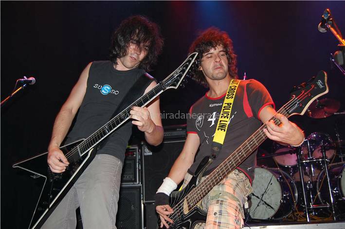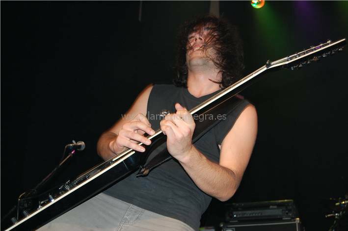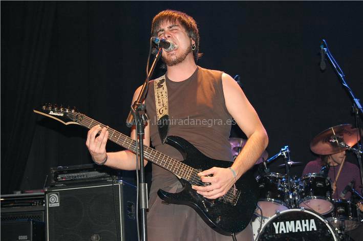 Los vizcainos Eon fueron los primeros en salir. Se trata de una banda en la que se aprecia un progresivo crecimiento, al menos consolidando un estilo más definido. Cada vez recuerdan más a Héroes del Silencio, sobre todo en la voz, que si no es original va ganando solvencia en el micro. He de reconocer que Héroes no es de mis bandas favoritas y tal vez por eso Eon tampoco me haya calado demasiado. Aunque yo diría que más que por estilo es por esa continua introspección musical que guarda demasiada energía para sí por lo que no les encuentro demasiada chispa. No es que las canciones no tengan fuerza, pero se tornan demasiado profundas, y sus directos no llegan a alcanzar el fuelle suficiente.