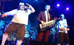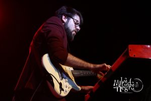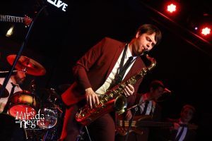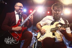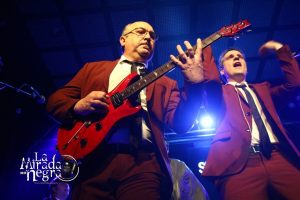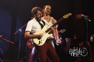 Entre apuntes jocosos la descarga continuaba con “Fundido A Negro”, con un par de personajes ataviados con trajes y mascaras dando una imagen apocalíptica. Y es que no por encontrarnos ante una banda con sentido del humor, sus letras dejan de tener mucho significado. Al margen de que todos los componentes son excelentes músicos cabe destacar que además son multinstrumentistas que sacan a relucir muchos recursos. Hay momentos en lo que podemos llegar a tener dos teclados sonando a la vez, con el propio Ángel Belinchón haciéndose cargo de ello puntualmente y Carlos Álvarez alternando su labor guitarrera principal con las teclas. El propio teclista Martí Bellmunt se hace cargo del saxo en momentos como los de “Me Pone A Cien”, con uno de los cómicos apareciendo con sombrero y maracas en escena, precedido de un “Rómpelo” que animó más si cabe al personal, desatando ya toda timidez con “Con La Música A Otra Parte”, haciendo que los presentes se marcaran un curioso baile que va más allá de levantar el puño, como toda la vida de dios se ha hecho en un concierto de rock. Pero es que lo de levantar el puño también se hace en un concierto de Dry River.