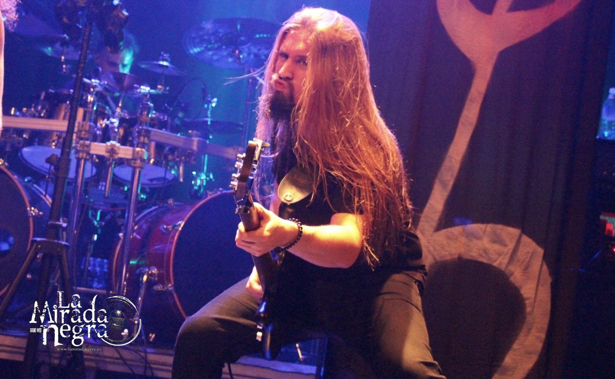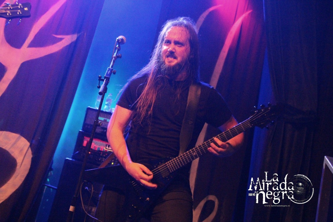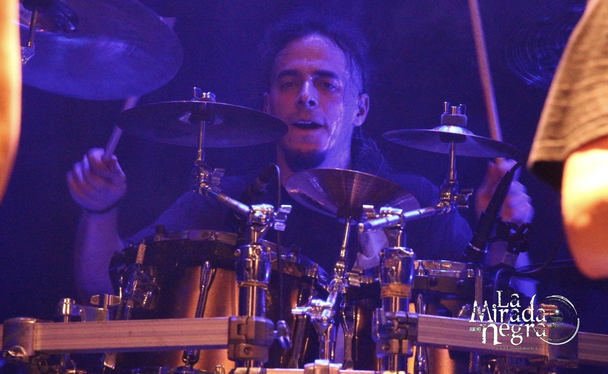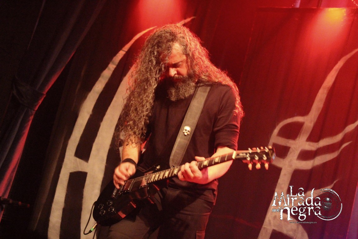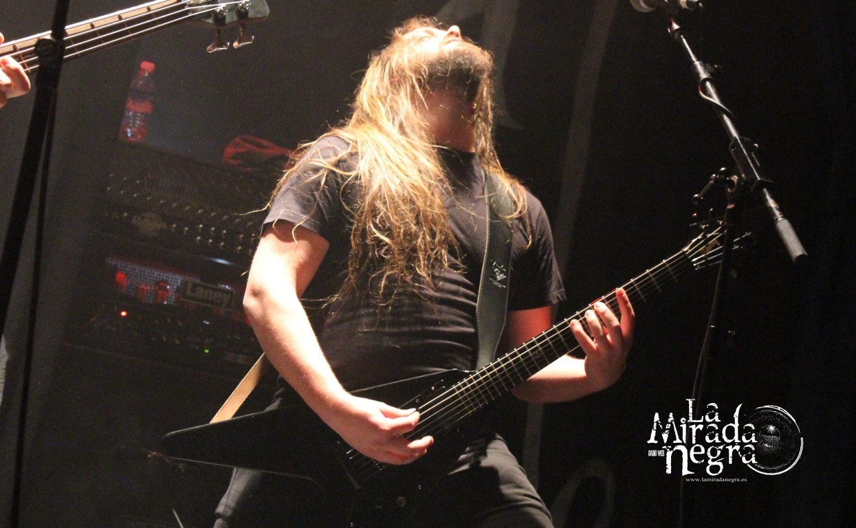 El grupo sonó atronador, dejando que su contundencia fuera cayendo sobre nosotros sin piedad con “All Those Lies That Dwells…”, precisamente el que cierra el disco para abrir la descarga, pero dando pie a entrar con un buen ritmo en la descarga, a lo que continuó “Worshipping Falsehood”. Gran trabajo de toda la banda, con Asier Amo mostrándose como un portento que no tardaría un minuto en comenzar a sudar, aunque casi no se le viera allí atrás, secundado por unos telones que adornaron el escenario en cuya parte central él se erigió en un motor que supo llevar a la banda por un recorrido exigente en ese plano rítmico.