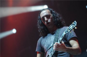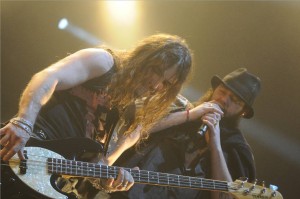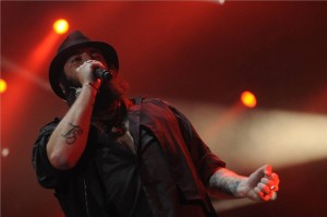 Cuando pasados cinco minutos de las diez de la noche sonaban los acordes de “Bienvenido Al Secadero”, canción que tan brillantemente abre la última “placa” de Marea y que los navarros han titulado “En Mi Hambre Mando Yo”, el público se volvió loco: miles de voces sinceras arropadas por los latidos de un solo corazón. Y ese mismo público que llenó el Palacio de los Deportes de la Comunidad de Madrid demostró con su presencia que Marea son grandes, muy grandes, “más grandes que la luz del día”. Esta eufórica bienvenida la enlazaron con “La Majada” (Kutxi se había despojado ya del poncho que llevaba puesto), “Duerme Conmigo” y “En Tu Agujero”. Después de tanto desparpajo de adrenalina Kutxi nos presentaba a Mikel Poza, autor del diseño de las calaveras que acompañan al grupo en el escenario y que “decoró” la actuación con sus graffitis demostrando una vez más que la música y el arte (callejero) mantienen una relación estable y duradera.