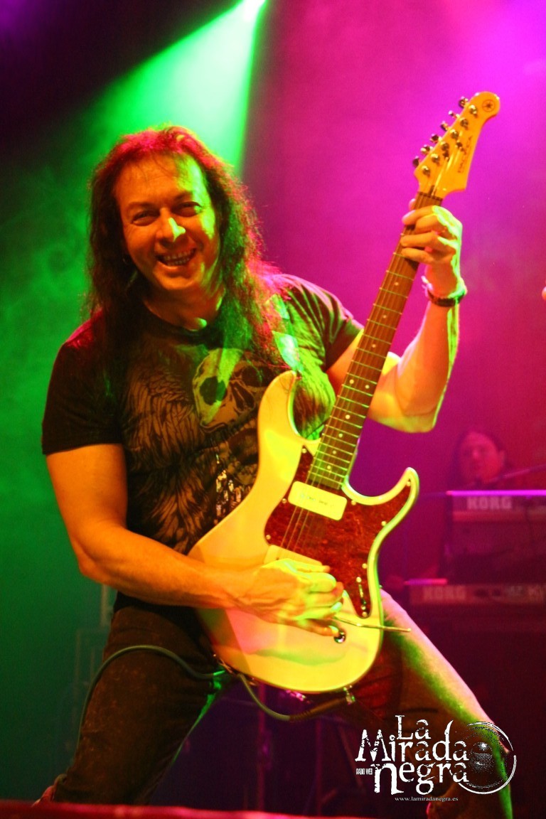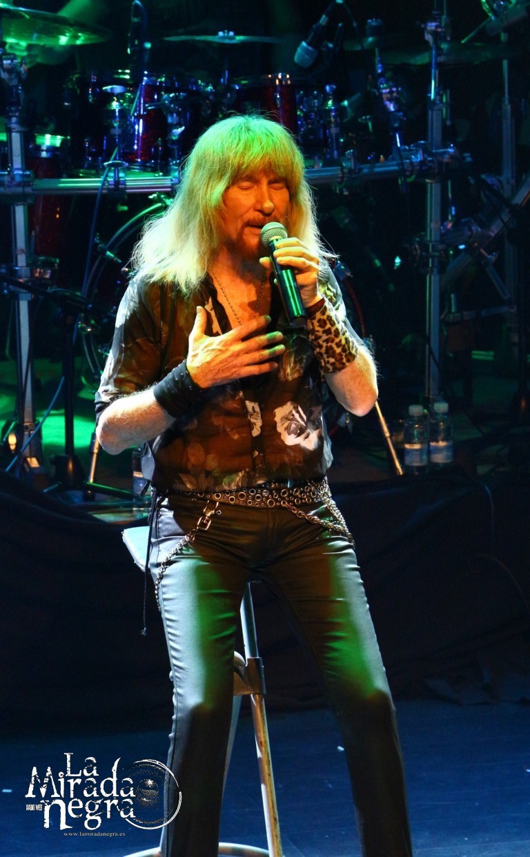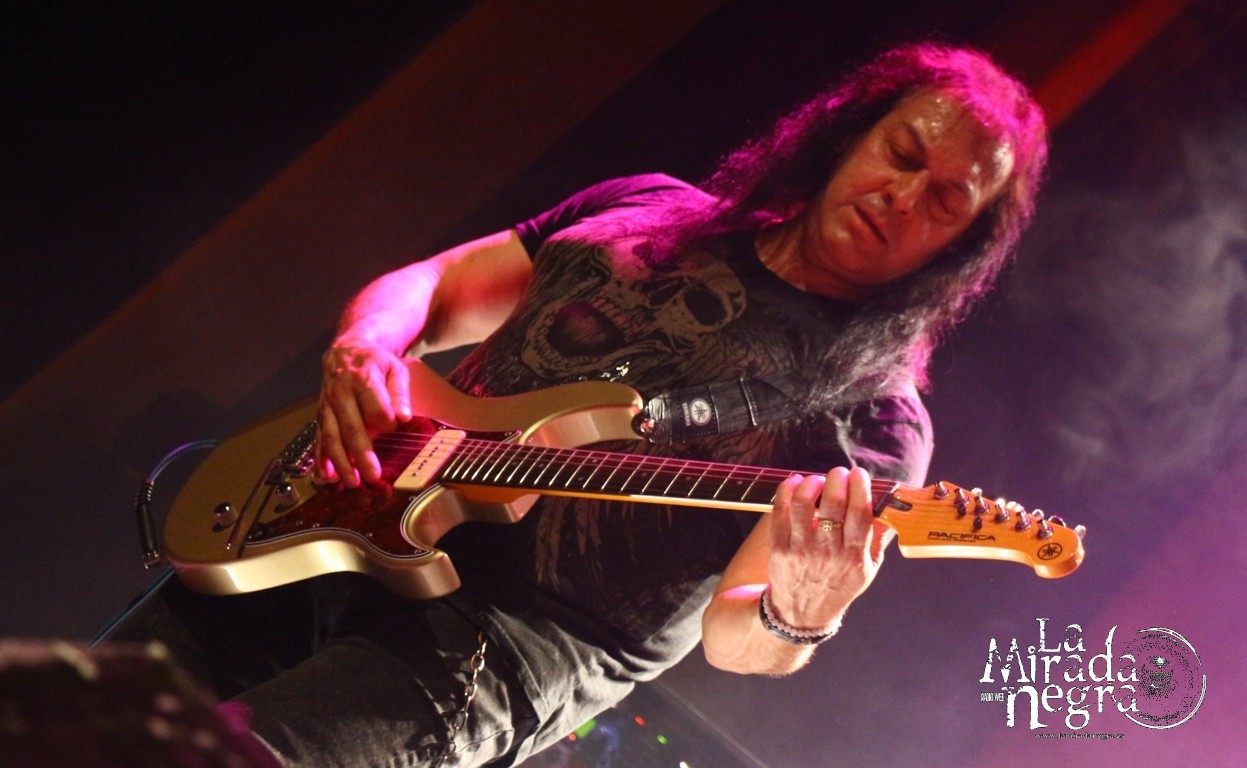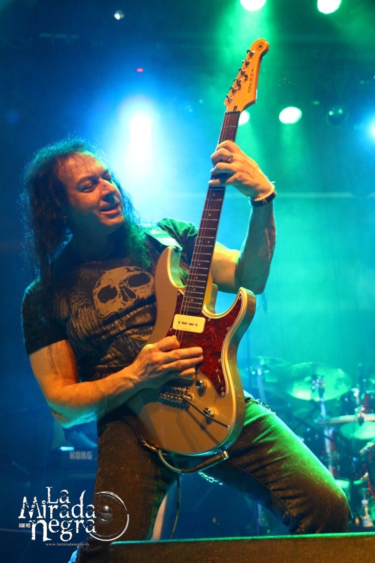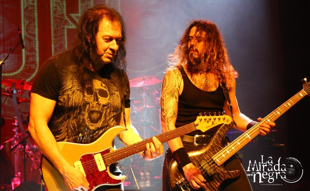 En ese primer tramo las palabras más repetidas por parte de Manuel Martinez fueron muchas gracias. No una sino varias veces al terminar cada tema. El público respondió ante la presentación de estas nuevas canciones, entre las que podemos destacar ese single de claro tinte arábigo “Juegos A Media Luz” o los primeros y directos, de grandes letras y excelentes estribillos “Aprendimos A vivir” y “Niños De Cristal”. Pero si he de elegir uno, ese sería “Un Grito De Amor”, con mucho gancho para los conciertos sin ser un tema facilón. Paco Ventura, aparte de seguir tocando la guitarra como los ángeles, se había percatado de cómo una chavalilla en primera fila, acompañada de su padre, no había dejado de cantar ni una sola de las letras de sus canciones, así que la animó a subir al escenario para cederle su micro contribuyendo a los coros de “Grita”. Es una de las personas que jamás olvidará esta noche, contando además con estos buenos detalles por parte un Paco Ventura que no duda en bajar a las escaleras a marcarse un solo ante nuestras narices si así se le requiere. Al final se marcan un detalle enlazando con el estribillo de “La Fiesta Pagana” de Mago de Oz, que si bien personalmente no me resulta excesivamente llamativo, a muchos de los presentes les puso a saltar irremisiblemente