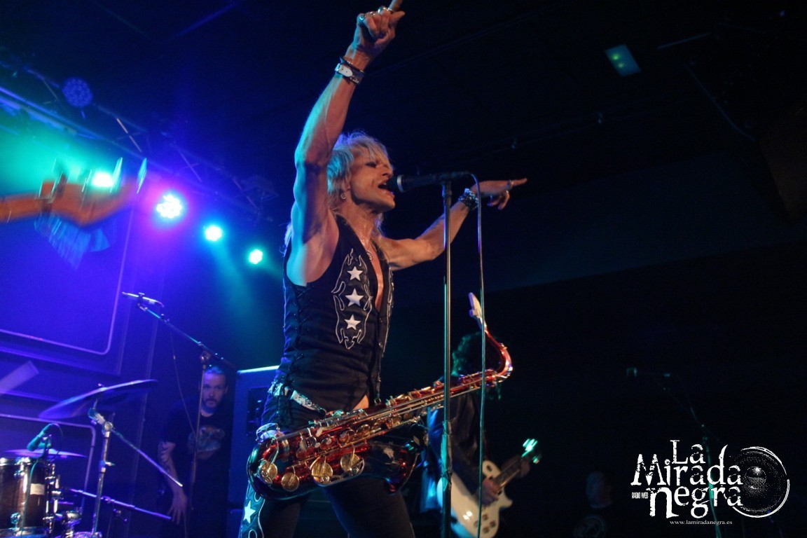 El saxo también utilizó Michael Monroe para interpretar uno de los clásicos de su antigua banda  como es “Underwater World”, con un tono más ambiental de lo habitual en una actuación salvaje que no ofrece prácticamente lugar para el respiro. Tan solo, si acaso, para presentar a la banda, dejando en último lugar Michael Monroe a su mítico compañero en Hanoi Rocks Sammi Jaffa al bajo, especialmente aplaudido por el personal junto a un Steve Conte que en un momento más cercano en el tiempo también ha pasado por las filas de la banda finesa. Sin dejar de lado el Rich Jones a la guitarra y de Karl Rockfist a la batería, el cual militara en Steel Prophet en el pasado. Consistente y efectiva banda que está a la altura técnica y visualmente de lo que requiere el show del vocalista, que campa a sus anchas sobre el escenario y que se mueve con una elasticidad juvenil, resultando incierta su edad a simple vista, con constantes muecas que llaman la atención. Un maestro del espectáculo de auténtico y puro espíritu rockero.