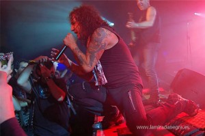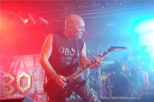 Con todo esto ya tienen unas cuantas bazas seguras, a lo que hay que sumar la forma en la que se muestra el grupo, resaltando el protagonismo de un Fortu que buscó a las chicas para cantarles ese “Dame Amor”, que se convirtió por ello en otro momentazo de los que tuvo la noche. Así hasta 18, que fueron los temas que interpretaron. Como suele ocurrir últimamente, alargaron el inicio de “Esta Ronda La Paga Obús” con las presentaciones, en las que termina el vocalista haciendo el pino tras presentar a toda su banda, con espectacular solo de batería de Carlos Mirat, quien se ayuda de sus compañeros para colocarse frente al escenario con tan solo un par de tambores con Paco y Fortu golpeando el suelo con dos cilindros de madera y Fernando Montesinos haciéndose cargo de la batería estándar. Todo ello nos lleva a la invitación del público a subir al escenario. Primero las chicas, con las que Fortu hace un poco de show, y luego un puñado de chicos para cantar ese tema que nos invita a ir a la barra, aunque como diría Fortu: esta ronda la pagas tú. Desde luego, en un concierto de Obús hay motivos para celebrar la fiesta que montan con inigualables himnos de heavy metal a los que le aplican una actitud y una capacidad sobre las tablas que explican por qué desde siempre se han comido en vivo a bandas supuestamente con más calidad. Visto lo visto, además de por conmemorar sus 30 años, el próximo lanzamiento en directo será un momento adecuado para plasmar la forma en la que Obús se encuentra en estos momentos.