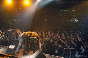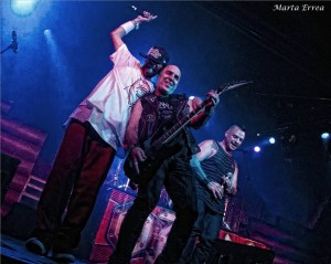 Para los bises se reservaron los temas “Sin Dirección”, “Mal Rollo”, interpretada junto a los raperos Duo Kie, “Cállate”, el himno que bautiza a la banda, “Va A Estallar El Obús”, – “os quiero”, nos gritaba Fortu – y “Esta Ronda La Paga Obús”, que sirvió de antesala para presentarnos a la banda – un magistral y siempre activo Fernando Montesinos al bajo, el colosal Francisco Laguna a la guitarra, un incombustible Carlos Mirat a la batería y Fortu, que salió en patines para demostrarnos su potencial circense haciendo el habitual pino en el escenario -. Luego invadirían el escenario algunos agraciados del público, amigos, la hija de Fortu, los invitados,… Veinte minutos que se alargaron y que quizás fueran los que menos gustaron a los presentes (podrían haber tocado un par de temas más; de hecho en el set list tenían previsto tocar el tema “Otra Vez En La Ruta”, que no tocaron), tiempo de sobra justificado ya que el heavy rock es espectáculo y Obús son el heavy rock. Un final de concierto algo embarullado que amenizaron con la ya habitual suelta de globos y confeti. Casi dos horas y media de actuación que enseñan al mundo el potencial de la banda en directo, tanto a los que estuvimos allí como a los que no, ya que el evento se grabó en DVD para deleite de todos. Felicidades Obús.