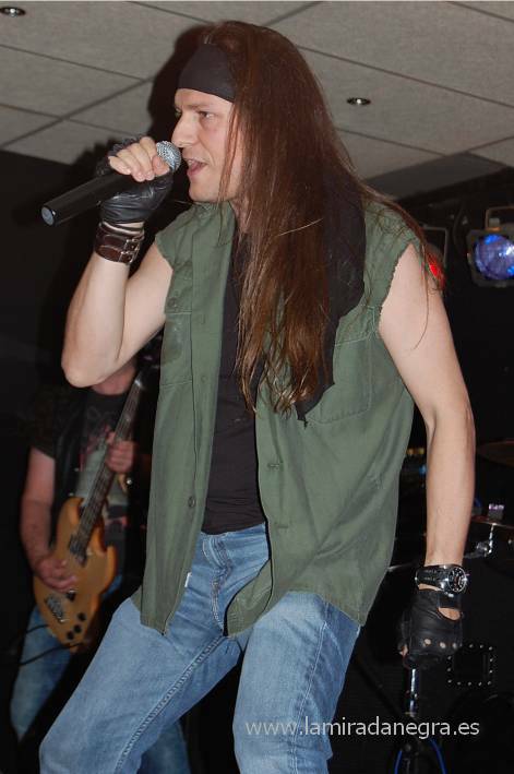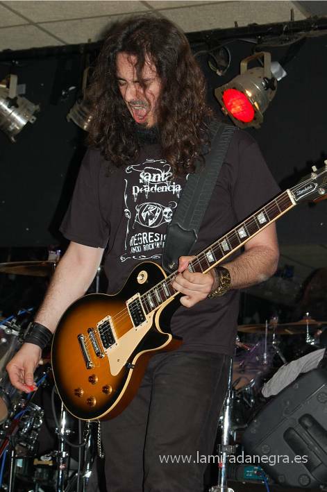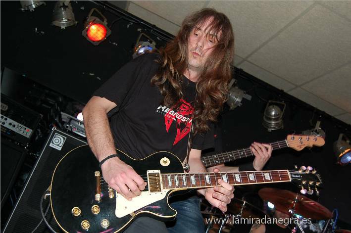 Llegaba el turno de Regresion, única banda original en el cartel, y pasó lo que no debería pasar entre un público rockero que se precie. Los hay que parece que ya han cubierto el cupo de bandas y han perdido la curiosidad por descubrir lo que se está haciendo hoy en día en estos sonidos. Por desgracia una parte del público abandonó la sala y se perdió el plato fuerte del cartel. Regresion son de los que pueden llevar con toda dignidad el legado de todas esas bandas clásicas de heavy metal que nos empiezan a dejar y llevarlo hacia adelante. Yo por lo menos apuesto por un futuro para esta música, cosa que no vamos a conseguir quedándonos en los grupos de siempre. Es por ello que sin ser nadie para decirle al público lo que debe o no debe hacer, faltaría más, si critico a esa gente que creyéndose rockeros en toda regla, no apoyan a los grupos que necesitan ese empujón y se conforman con lo de siempre. No lo digo gratuitamente, sino porque Regresion es uno de los grupos que merecen una respuesta mayoritaria por parte de los que todavía estamos subidos en el barco.