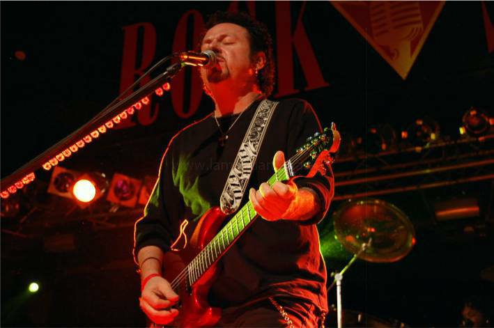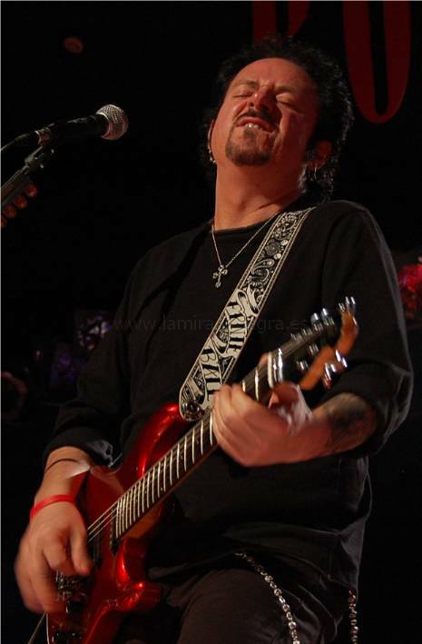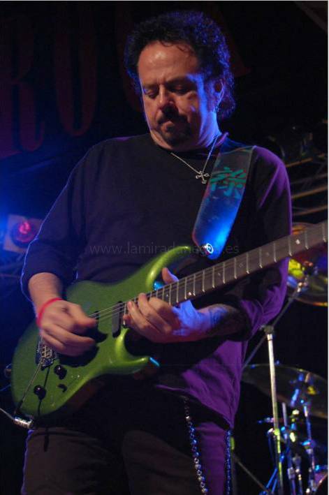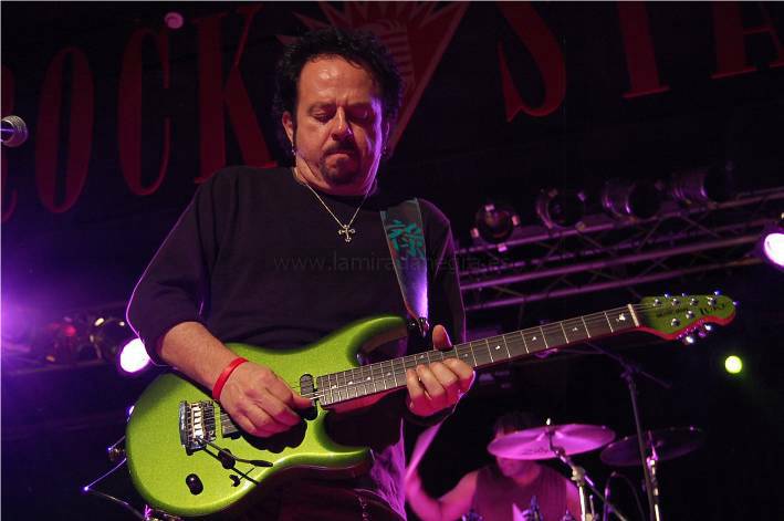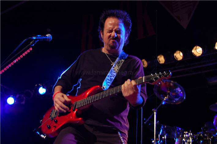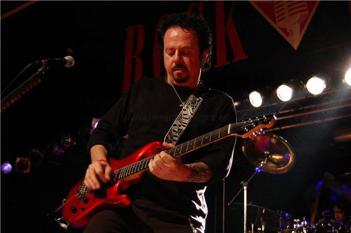 Una figurita del guitarrista se encontraba, a modo de curiosidad, al frente de la batería. Con “Darkness In My World” comenzó Steve a hacer funcionar su guitarra. Una de las representaciones de su última obra “All´s Well That Ends Well”. Este inicio ya dejó entrever que el guitarrista venía con un aura menos bluesera que en su anterior visita. Considerado uno de los guitarristas más versátiles del mundo, esta noche demostraría por qué. En este inicio, muy ayudado por el color del que dotaban a las canciones la presencia de Eric en la batería y Renee en el bajo, el concierto llevó un tono muy mestizo. “Always Be There For Me”, donde la bajista hizo unos coros formidables, “Extinction Blues” y “Stab In The Back” fueron matizados por la fusión de estilos. El grupo se mostraba a un nivel asombroso, musicalmente insuperable, pero era algo frío el ambiente en una sala que se quedó, injustamente, demasiado grande. Pensé que tal vez un cierto aire de decepción podía recorrer la mente de los músicos cuando la actuación comenzó a crecer en emoción y en calor a partir del instrumental “68”, que nos mostró todo un recital guitarrístico por parte de Lukather. Cuando realizó el solo de “Brodie´s” un aplauso se extendió por el recinto en medio de esta composición, cosa que captó el guitarrista que terminó el tema con un gesto de orgullo y de seguridad mirando a la concurrencia. Si hasta aquí todo había sido un recital de cómo transmitir la música en vivo, de ahí en adelante el concierto adquirió ya un carácter de ritual, de unión y de apoyo incondicional hacia Steve Lukather y su banda.