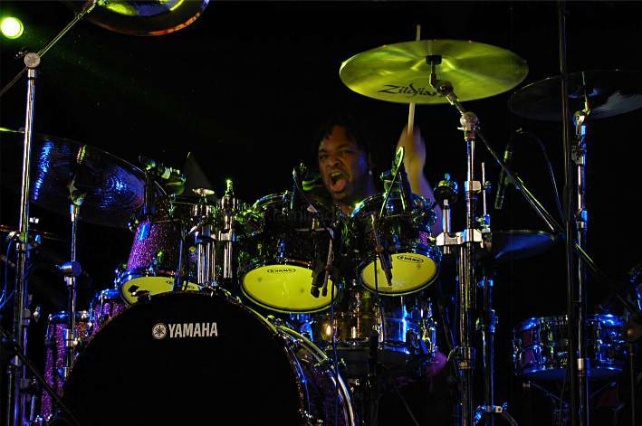 El tono jazz que le dieron a la versión de Hendrix “Up The Skies”, dedicada a Gary Moore, nos dio un nuevo giro, siendo una de las camaleónicas adaptaciones que nos ofrecieron los músicos a lo largo de la noche. Después pasamos a una fase progresiva donde la banda desarrolló una exhibición técnica no reñida con el feeling, que poseen en gran cantidad. “Song For Jeff” comenzó con una pequeña broma con el teclado, demostrando una gran distensión sobre las tablas. Guitarrista y teclista arrancaron en solitario antes de dar paso de forma enlazada a “Don´t Say Its Over”. Una parte instrumental de la actuación que se completó con una pequeña jam de los tres acompañantes de la figura principal de la velada y con la soberbia interpretación del extenso “Tumescent”, donde además de un verdadero despliegue de calidad asistimos a un momento de mucha complicidad por parte de los músicos, haciéndose guiños entre ellos que demostraban un royo muy bueno, lo que sin duda contribuye a que una banda funcione con este rendimiento. Casi al final del tema Eric Valentine realizó un solo de batería sublime, cargado de fuerza y técnica. Este hombre impresiona con su sola figura tras los tambores, sabiendo resultar visualmente espectacular, pero es que además demuestra una capacidad reservada solo a los mejores. La banda regresa para arroparle y terminar el elaborado tema que nos hizo pasar el ecuador de la descarga.