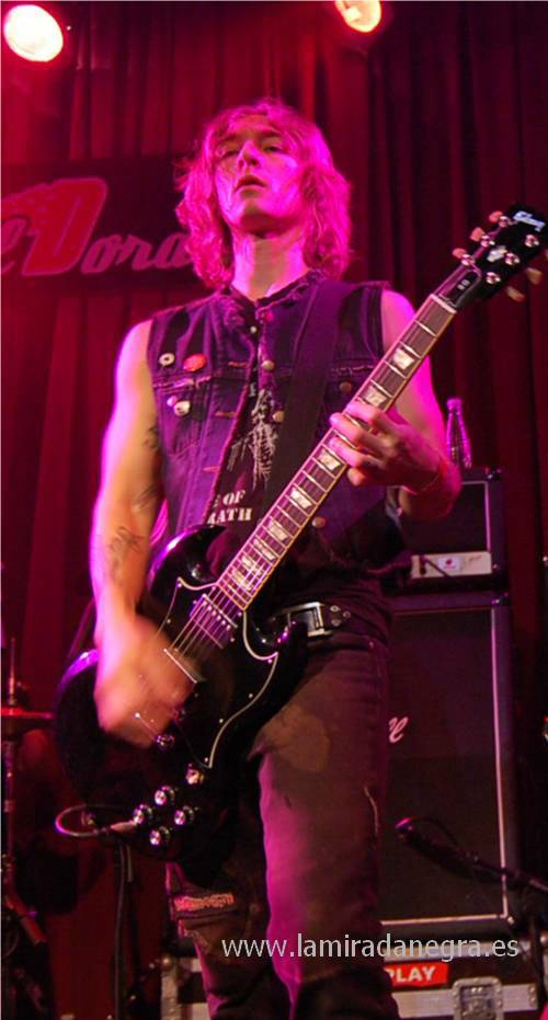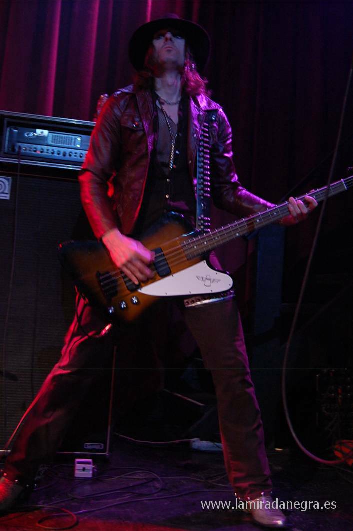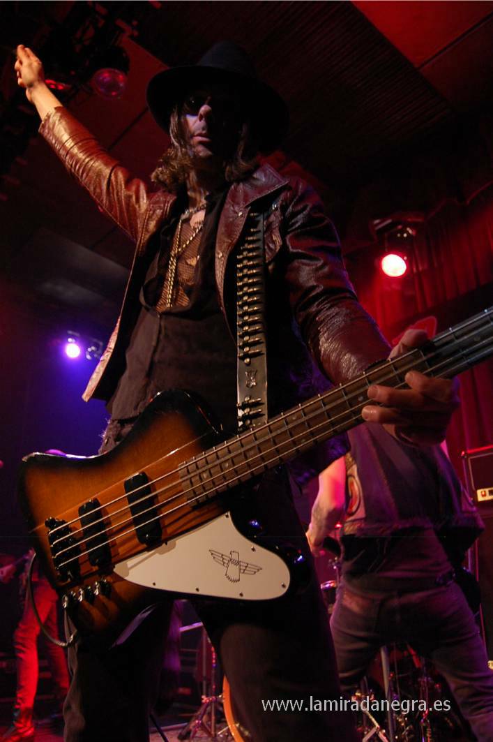Si no me equivoco han sido 14 fechas por suelo estatal las que han realizado, siendo esta ya en un momento adelantado de la gira. Pues bien, viéndoles salir al escenario más bien pareciera que era la primera, dadas las ganas con las que empiezan a rugir las guitarras de “Whatever Gets You Off”. Enseguida se convierte Chad Cherry en la imagen que atrapa todas las miradas, incluidas las de unas cuantas chicas muy jóvenes que en las primeras filas alucinaron con la actuación y enloquecieron a cada guiño del cantante. Tenía la sensación en ese instante de que nos habíamos ido a algún garito perdido de Los Angeles a mediados de lo 80. No solo me lo expresaba la imagen del grupo, cuya indumentaria no necesita mayor escenificación que su propia actitud, también este tipo de detalles.