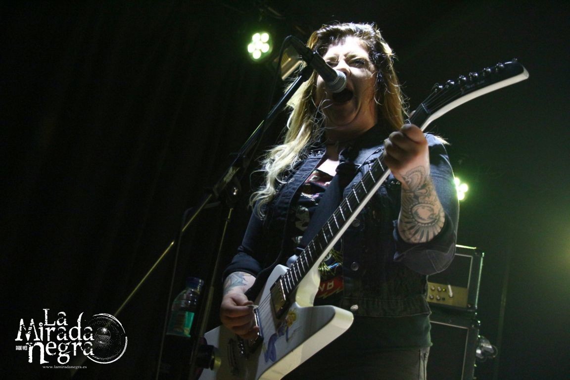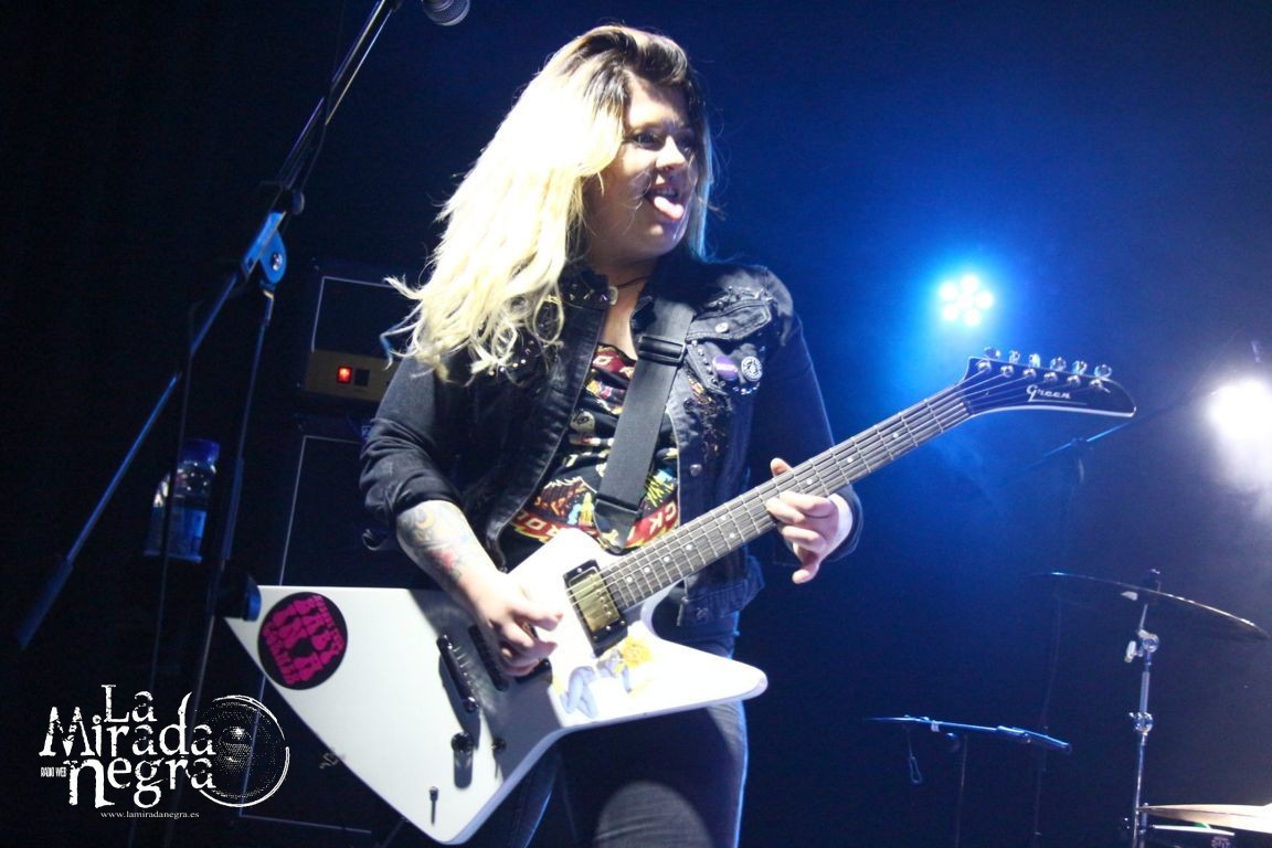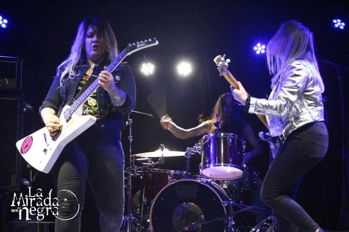 Con un ritmo trepidante casi sin darnos cuenta llegamos al ecuador de la descarga, marcado por el breve solo de batería de Oliver, dando paso la versión de de “Rock & Roll” de Led Zeppelin con la que siguieron metiéndose al público en el bolsillo. Claro que para ello tampoco se quedan atrás temas propios como “The Code Of The Road” y “Attitude” ambas tan significativas de lo que expone una banda destinada a hacerse kilómetros buscando garitos en los que descargar y, por supuesto, con una actitud que queda patente en cada destello que desprenden estas chicas; en cada patada que suelta al aire Ida, un gesto muy característico suyo.