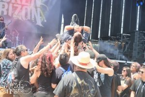 Por tomarme las cosas con relativa calma solo asistí a una parte de la actuación matinal, ya que la jornada en el recinto del festival se hace larga si uno pretende ver a todas o al menos a la mayoría de bandas del cartel. Y la primera actuación estaba programada a las 3 de la tarde, antes de las cuales ya estábamos por el recinto, aunque con la habitual espera en taquilla no pude llegar para ver demasiado de The Broken Horizon, que estaban echando abajo el Silver Stage, como en ellos suele ser habitual. Abajo del mismo acabaría su vocalista, que pidió al personal, aun no muy numeroso, que no dejara que sus huesos dieran en el suelo. El público no le defraudó y pudimos verle volar sobre las cabezas de los asistentes a primera hora en un día de agradable temperatura. De los mejores que hemos tenido en la zona en los últimos días. No era mal presagio para que la jornada fuera todo un éxito.