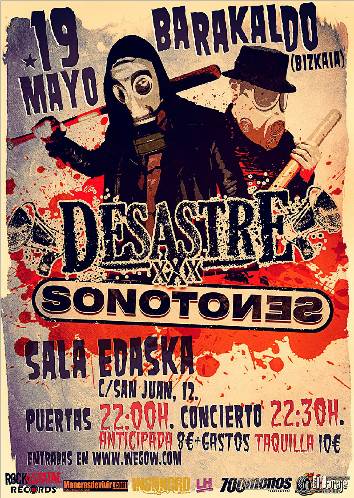 Desde Madrid visitan el Edaska Rock Club dos bandas de rock urbano que cumplen ambas 30 años en activo con muy buena salud y nuevos trabajos editados. DESASTRE son del madrileño barrio de Usera y desde sus inicios han practicado rock urbano crítico y transgresivo con letras cargadas de sentimiento que cuentan la cruda realidad de los barrios del extrarradio de una gran ciudad. Darán cuenta de su nuevo disco “No Hay Sitio Para Nadie Más”. SONOTONES por su parte practican un rock urbano más agresivo y con guiños al punk rock y presentan su nuevo album “No Hay futuro”.