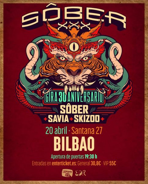 La gira 30 aniversario de Sôber que junta en un mismo cartel a estos con Skizoo y Savia pasará por la sala Santana 27 de Bilbao el próximo 20 de abril de 2024.