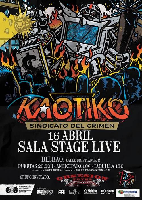 El próximo Viernes 16 de Abril Kaotiko presentarán su nuevo álbum «Sindicato del crimen» en Stage Live de Bilbao. Les estarán acompañando OBSESION FATAL. Laaperturade puertas será a las 20:30h y las entradas cuestan 10 € anticipada y 13 € en taquilla.