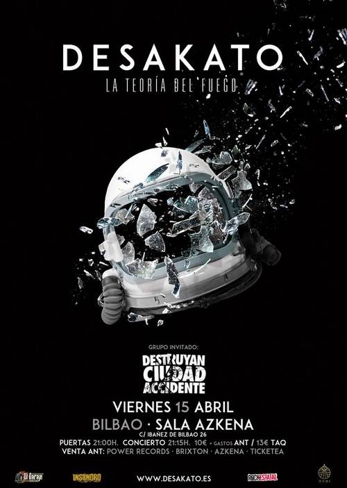 DESAKATO estarán presentando su nuevo trabajo ‘La Teoría del Fuego’ el viernes 15 de abril a partir de las 21:15 en la sala Azkena de Bilbao. Los asturianos estarán acompañados por DESTRUYAN CIUDAD ACCIDENTE. Las entradas cuestan 10 euros + gastos anticipada y 13 euros en taquilla.