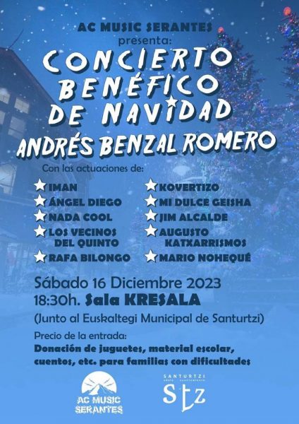 Os dejamos el cartel del Concierto Benéfico de Navidad Andrés Benzal Romero organizado por AC Music Serantes. Concierto ya tradicional en formato acústico que definitivamente se queda con este nombre como homenaje a uno de los principales impulsores de esta idea y que tiene como coste de la entrada la donación de juguetes, material escolar, cuentos, etc.