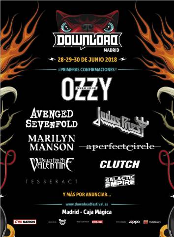 Download anuncia los primeros nombres que formarán parte del cartel de su segunda edición en Madrid, que se celebrará en la Caja Mágica los días 28, 29 y 30 de junio. OZZY OSBOURNE – cuya actuación en el festival está incluida en su gira de despedida “Farewell Wold Tour” – AVENGED SEVENFOLD, JUDAS PRIEST, MARILYN MANSON, A PERFECT CIRCLE, BULLET FOR MY VALENTINE, CLUTCH, TESSERACT Y GALACTIC EMPIRE estrenan un cartel de envergadura que irá confirmándose en las próximas semanas.