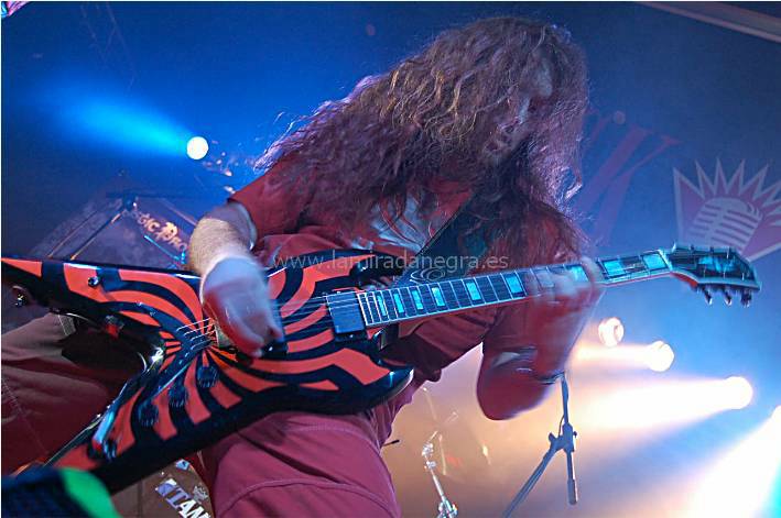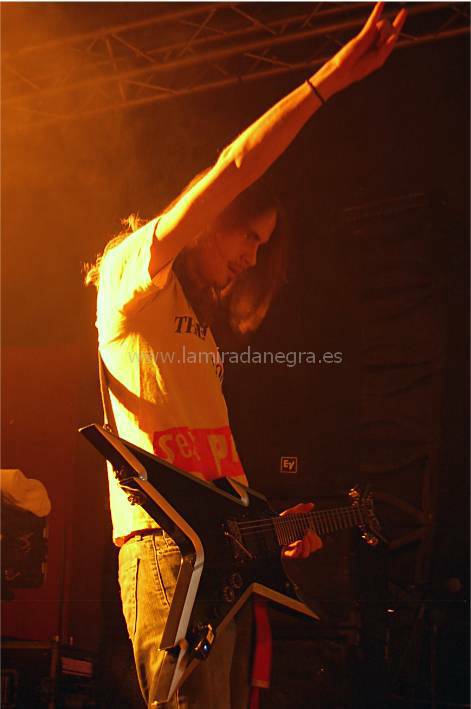 El vocalista, por su parte, también se encargó de que los ánimos no decayeran. Tras un fulminante comienzo con “Across The Gates Of Hell” y “Masters Of Sins”, que cayeron como agua de mayo en los oídos de todos los ávidos de una propuesta de estas características, ya nos picó con un ¿estáis preparados para el rock and roll?, el cual dio paso a “Dark Forces”. Tras el mismo, la pregunta fue si éramos nosotros mejores que Madrid, donde estuvieron la noche anterior. ¿Qué más necesita el público aquí para enchufarse más si cabe en temas como “Demons Blood”, “We Kill You Die” o “Sacrifice Me”. Tras este momento Liapakis regaló un par de camisetas al público, cosa que se agradeció, aunque tras hacer el torero con uno de sus guitarristas también recibió algún silbido.