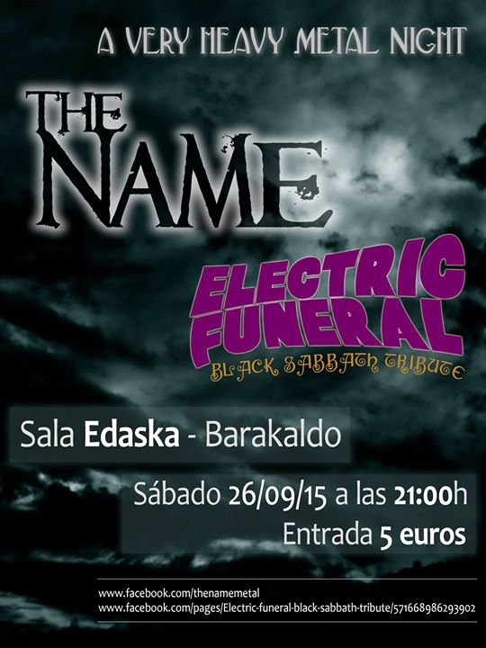 El próximo sábado 26 de septiembre, a partir de las 21:00 horas y al precio de 5 € la entrada, las bandas vizcaínas de Metal THE NAME y ELECTRIC FUNERAL ofrecerán un concierto muy especial en la Sala Edaska de Barakaldo(C/ San Juan, 12).