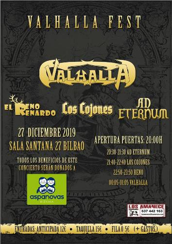 Tras casi 10 años de parón, Valhalla volverá a pisar el escenario en un ÚNICO CONCIERTO. Y que mejor manera que hacerlo en una buena juerga con los demás proyectos musicales de los integrantes de la banda: Ad Eternum, Los Cojones y El Reno Renardo.