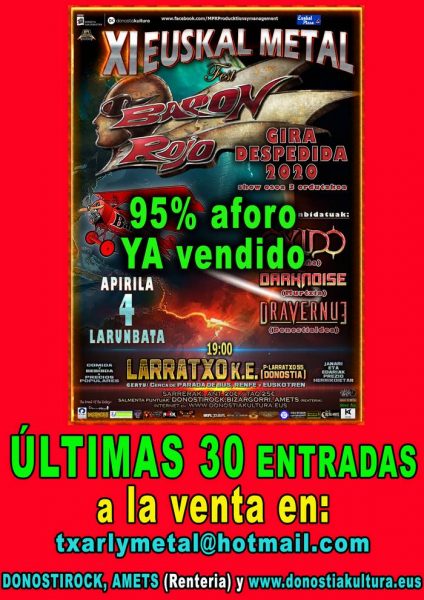 A un mes de la cita con el XI EUSKAL METAL FEST la organización nos avisa de que las entradas para ver este festival encabezado por Barón Rojo en su gira de despedida están a punto de agotarse. Os dejamos la info el festival y de las bandas remitida directamente por la promotira MPR Producciones: