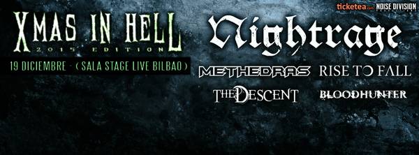 La edición del 2015 del festival navideño XMAS IN HELL de Bilbao cierra su cartel. Los bizkainos RISE TO FALL y THE DESCENT completan el festival junto a NIGHTRAGE (SWE), METHEDRAS (ITA) y BLOODHUNTER. Tendrá lugar en la sala Stage Live de Bilbao el sábado 19 de Diciembre de 2015. Precio: Ant. 15e / Taq. 17e
